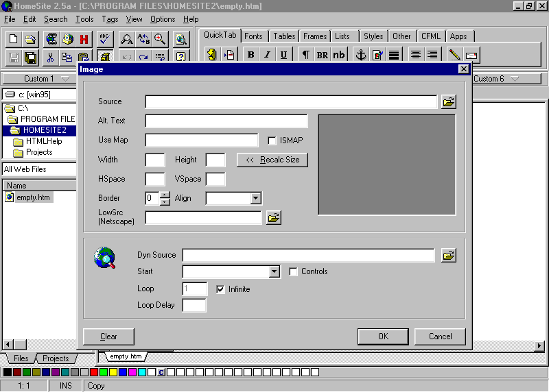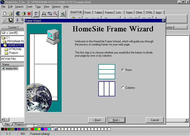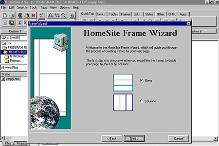 HomeSite 2.5 offered support beyond the standard HTML 3.2 by including browser-specific tags like Internet Explorer’s Bgsound and Navigator’s Embed. Additionally, HomeSite 2.5 allowed for easy page viewing by using Internet Explorer 3.x as its browser directly within the HomeSite interface.