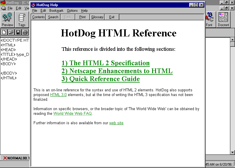 On June 29, 1995, the Australian software company Sausage Software officially released the first version of the HotDog 1.0 web editor. HotDog Professional 2.0 was released in 1996.